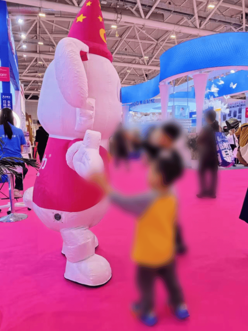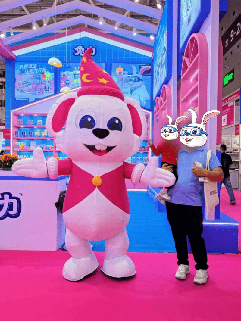 展會期間,兔力標(biāo)志性的DR.兔力IP形象成為全場焦點。身著白大褂、佩戴護目鏡的“科學(xué)兔”形象,傳遞了品牌“專業(yè)、安全、有效”的產(chǎn)品理念;而充氣魔法兔人偶則憑借軟萌可愛的造型,吸引了大量觀展觀眾駐足互動,不少家長帶著孩子爭相與IP人偶合影打卡,展位前始終人氣高漲。
